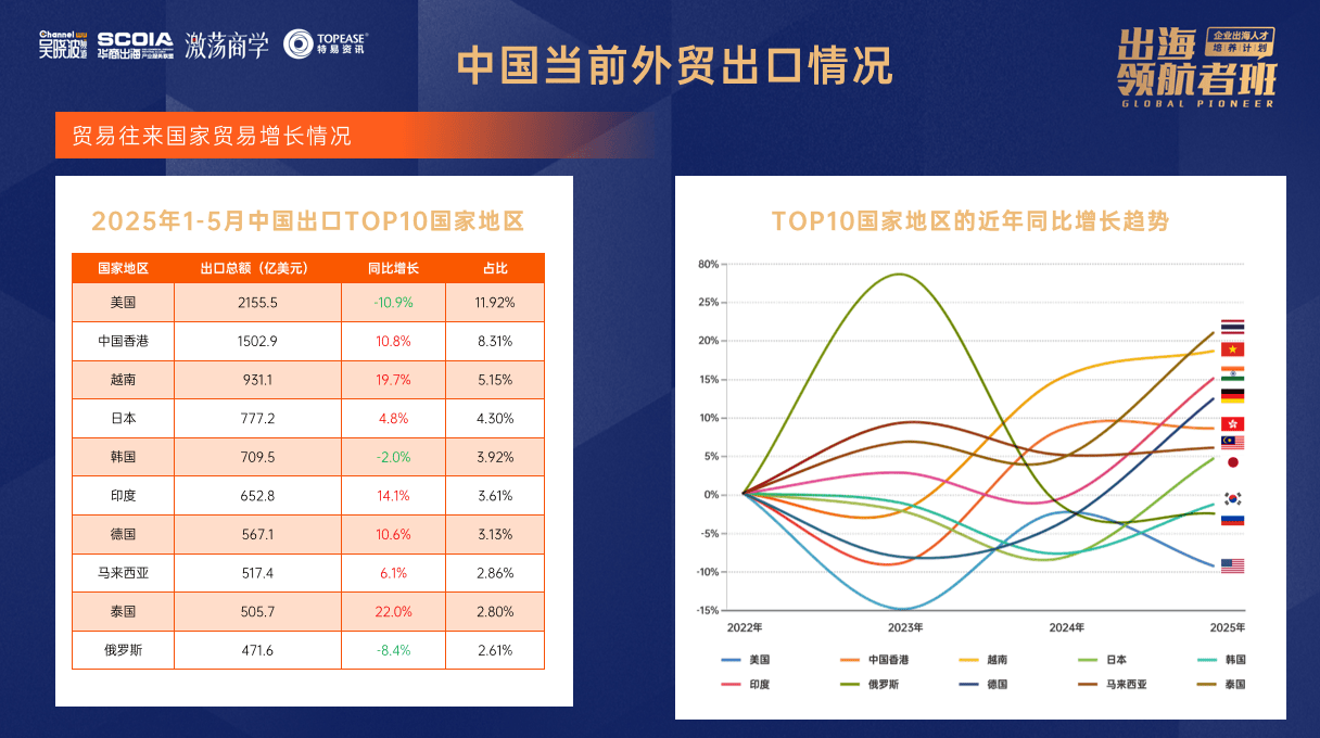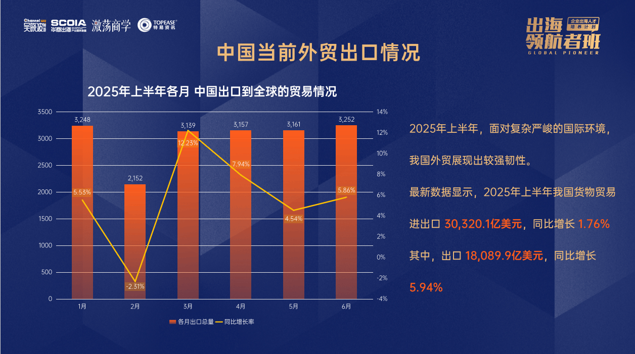 本次勾当中,特易资讯市场总监王骁锦受邀颁发《2025 年上半年出海趋向取商业品类增加解析》从题,连系全球商业大数据取数字化实践,为参加企业家分解出海新机缘。2025 年上半年我国外贸展示较强韧性,货色商业进出口总额达 30,320。1 亿美元,同比增加 1。76%,此中出口 18,089。9 亿美元,同比增加 5。94%。从月度走势看,3 月出口同比增加 12。23%,4-6 月连结不变增速,反映出我国外贸正在复杂国际中的适配能力。